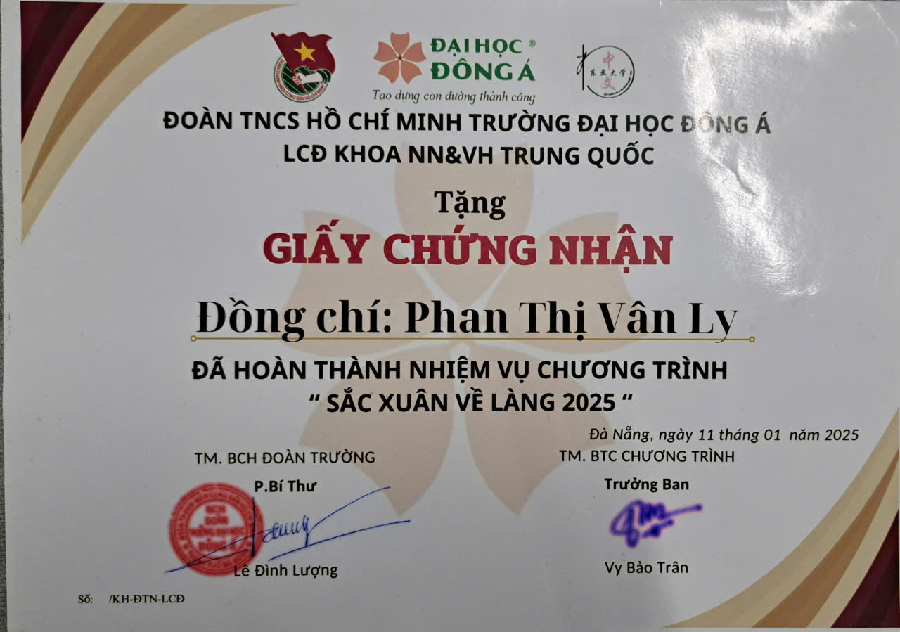 Xin chào, tôi là Vân Ly, sinh viên năm 3 ngành Ngôn ngữ Trung tại Đại học Đông Á. Tôi đã tham gia các hoạt động như thực hành dịch thuật, câu lạc bộ tiếng Trung và thực tập, tích lũy được kinh nghiệm thực tế. Tôi là người có trách nhiệm, ham học hỏi và mong muốn ứng tuyển vị trí Trợ lý phiên dịch để phát triển bản thân và đóng góp cho công ty. Xin cảm ơn quý côg ty đã dành thời gian!