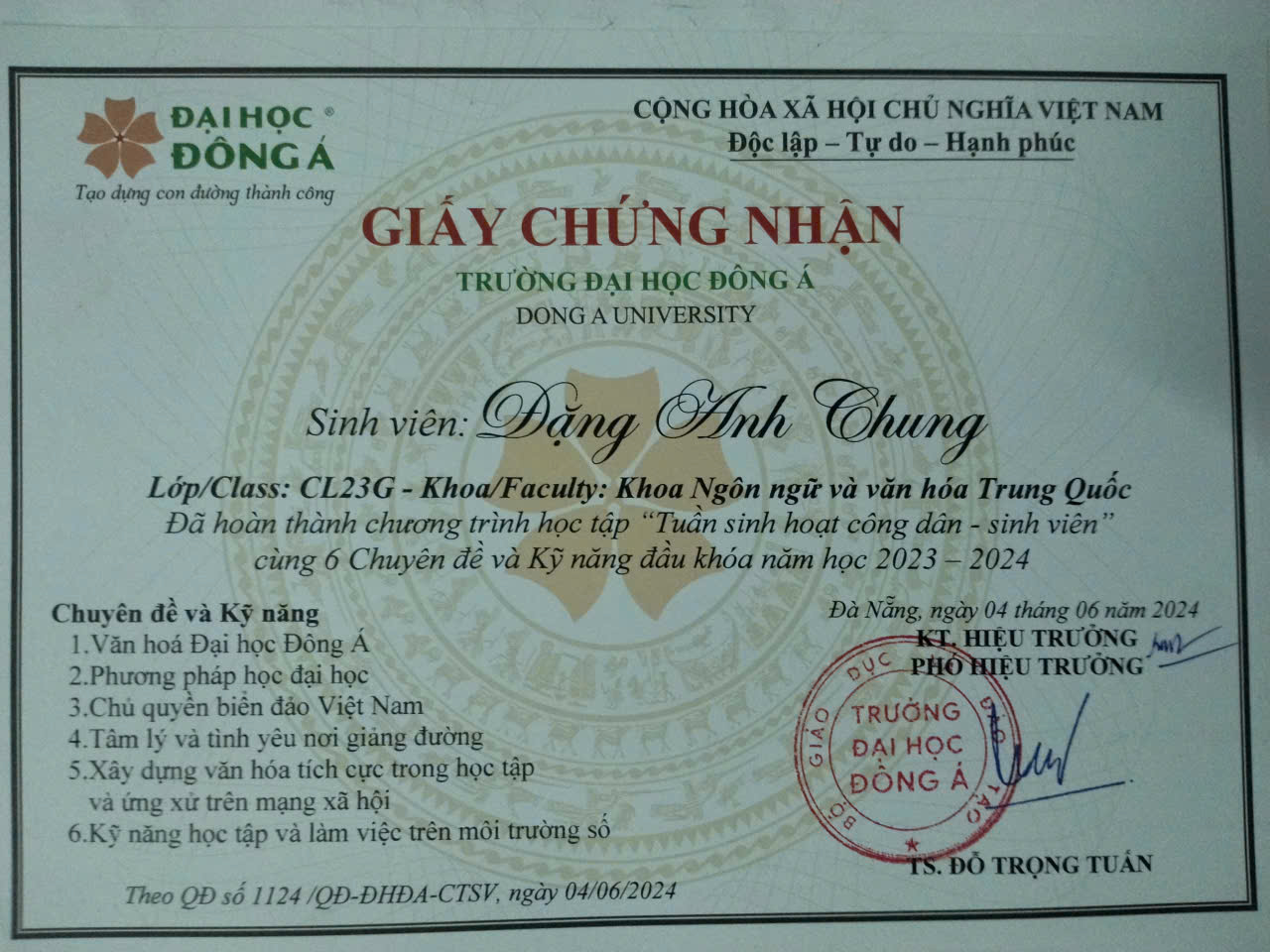 Sinh viên năm 3 ngành Ngôn ngữ và Văn hóa Trung Quốc, có nền tảng tiếng Trung vững chắc, kỹ năng giao tiếp tốt và tinh thần trách nhiệm cao. Chủ động, cầu tiến và có khả năng thích nghi nhanh với môi trường mới. Định hướng trở thành trợ giảng và phát triển lâu dài trong lĩnh vực giảng dạy hoặc biên phiên dịch tiếng Trung. 我是一名东亚大学中文语言与文化专业的大三学生,具备扎实的汉语基础,拥有良好的沟通能力和较强的责任心。我积极主动,适应能力强,具有良好的学习态度。未来希望从事中文教学或翻译相关工作,并通过助教岗位不断提升专业能力。